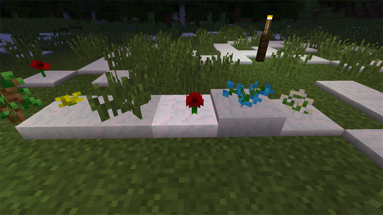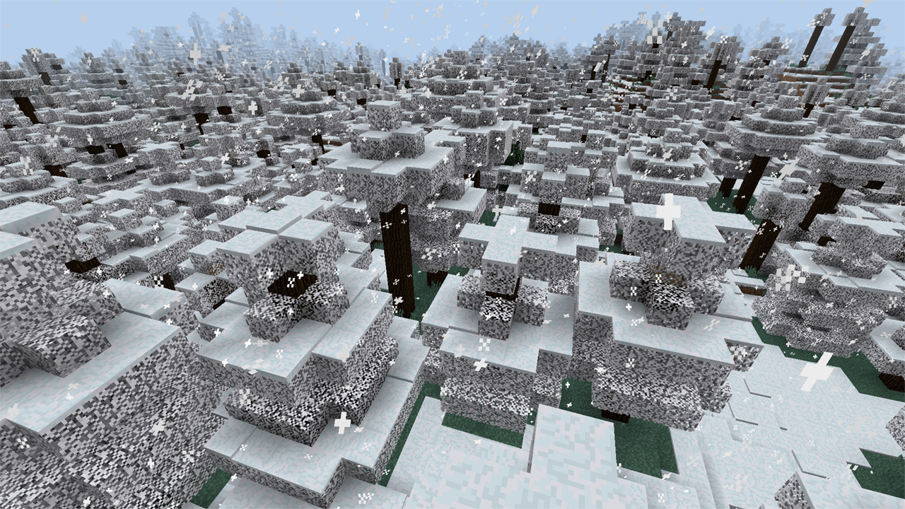 Во время непогоды (т.е. когда в тёплых биомах идёт дождь, а в холодных — снег), у деревьев постепенно меняется цвет листвы, пока она не становится белой. Выглядит это просто волшебно. Заходишь в зелёный лес, пусть слегка занесённый снегом, начинается снегопад и вдруг, ты замечаешь, что зелень кругом теряет яркость, а ещё через несколько минут всё вокруг становится белым: лес буквально перерождается.