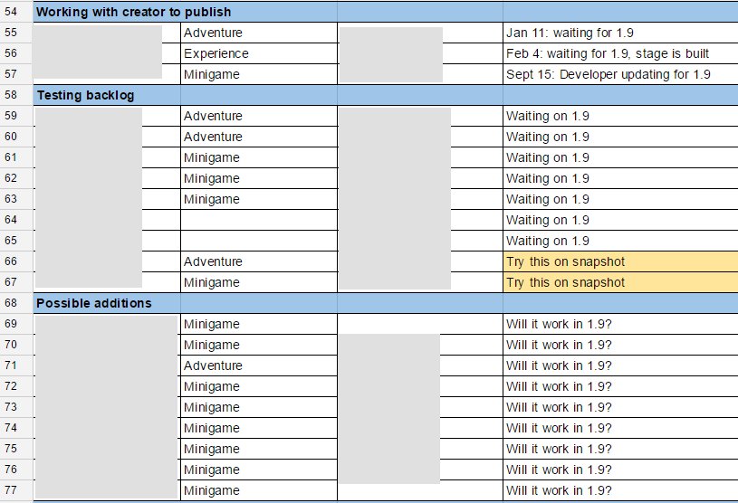 В начале февраля Марк Уотсон опубликовал в твиттере табличку с перечнем задач по подготовке Realms к Minecraft 1.9. Несмотря на замазанные названия пункты, можно судить о том, что работа ведётся большая как касательно обновления старых карт, так и по добавлению новых. Судя по всему, уже тогда было известно, что в Realms добавят три новые карты. При этом есть ещё большой список, которы «под вопросом».