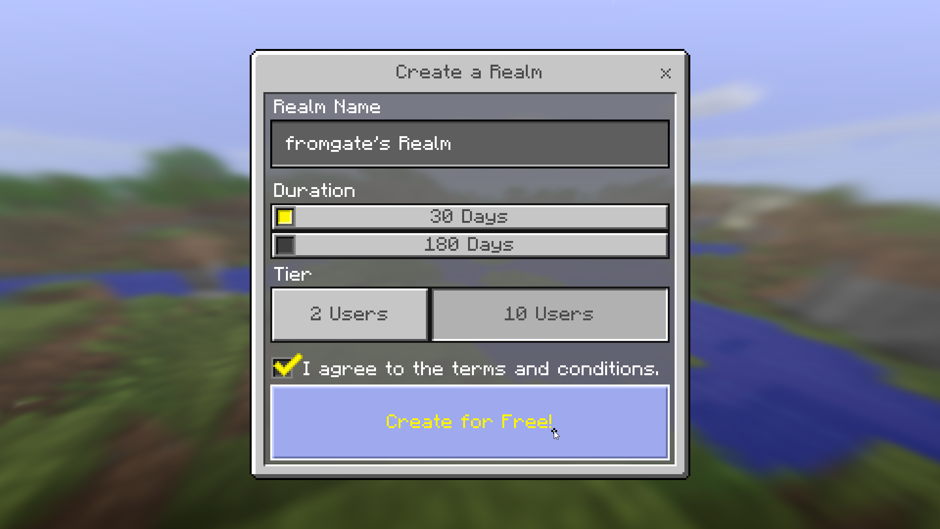 Здесь, соответственно нужно нажать на кнопку создания нового реалма. В появившемся окне необходимо задать название реалма, срок (30 дней) и численность игроков — 10 человек. Это даст возможность создать бесплатный реалм. Все остальные комбинации, приведут к необходимости оплаты (даже если указать 2-х игроков меньше десяти, то всё равно надо будет платить).
