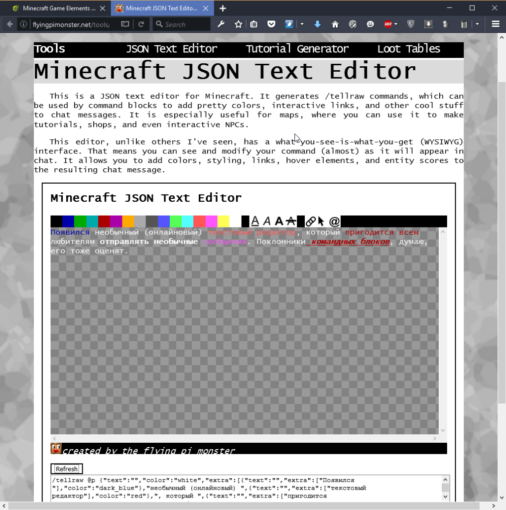 Текстовый редактор, представленный на сайте flyingpimonster.net, позволяет ввести текст, задать ему оформление и сгененировать команду tellraw с соответствующими параметрами, которой можно будет либо сразу воспользоваться, либо указать её в командном блоке.