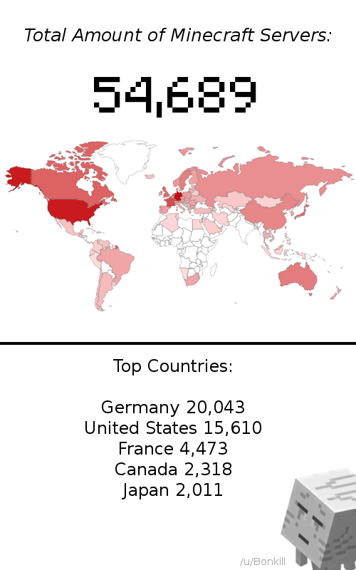 Больше всего серверов расположено в США (почти 32 тыс.) и Германии (30 тыс.). В России,расположено 2556 серверов. Зато на родине Майнкрафта в Швеции — всего лишь 613.