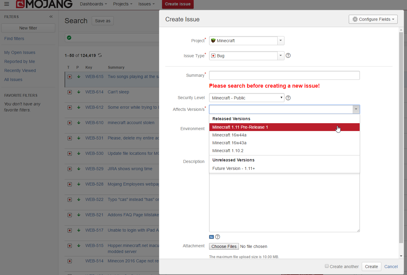 На официальном баг-трекере Mojang, при создании сообщения об ошибке, в списке версий появилась строчка Minecraft 1.11 Pre-Release 1. Эта запись указана сразу перед названием версии 16w44a — снапшоте, который вышел на прошлой неделе.