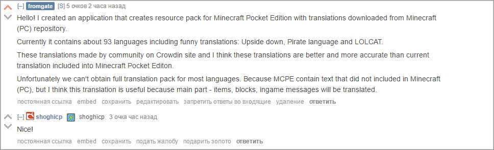 Надеюсь, что это приложение будет полезно тем, кому привычнее перевод Майнкрафта из ПК-версии и для тех, чей родной язык так и не попал в Minecraft Pocket Edition.