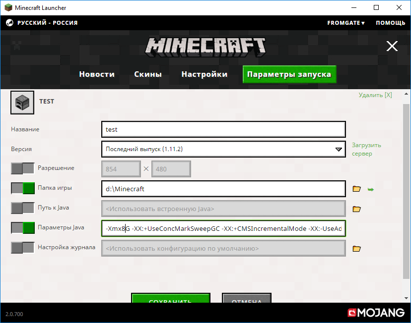 Параметры запуска позволяют настроить выбрать произвольную версию игры, а также воспользоваться модифицированной. Т.е. когда вы установите Forge, то он добавится к этому меню. Кроме того, можно настроить и другие параметры: разрешение окна игры, папку в которой будут храниться файлы игры, версию Java (просто указав путь к ней), а также настроить параметры Java — например, объем выделяемой оперативной памяти. Кроме того, предусмотрена возможность использования разных конфигураций для журнального файла игры.
