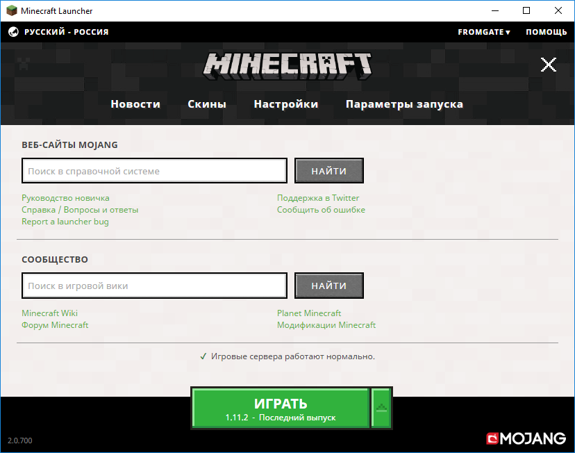 Пункт меню «Помощь» открывает отдельную страницу лаунчера, где сосредоточены ссылки на основные ресурсы от баг-трекера игры до ссылки на самый большой форум, посвященный Майнкрафту. На этой же странице можно будет наблюдать статус серверов авторизации пользователей.