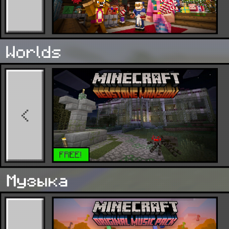 - Добавлен раздел Миры (Worlds) в магазин, с возможностью загрузки шаблона мира с картой Redsone Mansion (Редстоуновый особняк) — этот мир потом появится в списке доступных шаблонов;