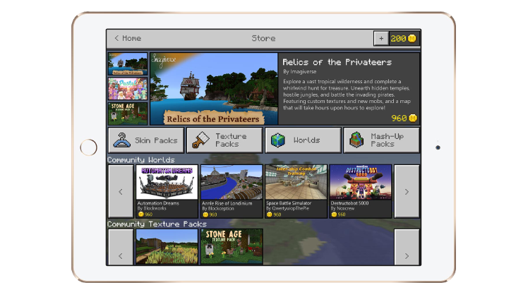 Чтобы всё это стало возможным, мы представляем Майнкрафт-монеты, которые можно будет купить прямо в приложении на вашем устройстве. Монеты позволят создателям устанавливать гибкие цены и получать свою долю от проданного. И это очень важно в обеспечении наивысшей выгоды. При покупке набора скинов или карты, цифровой магазин может забирать порядка 30%, но всё остальное будет доставаться авторам.