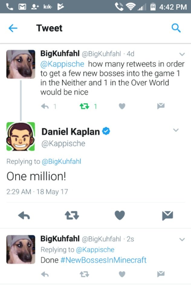 Дэниел Каплан, руководитель по развитию бизнеса, отвечая на вопрос игрока «Сколько нужно ретвитов, чтобы добавить в игру 2-х боссов — одного для Незера и одного для обычного мира», сказал: «1 миллион!».