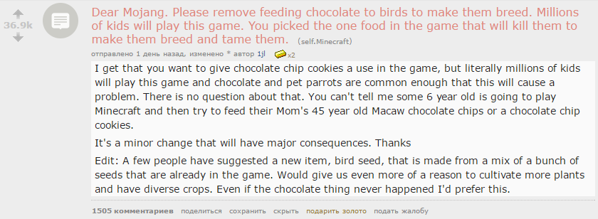 «Дорогая компания Моджанг! Пожалуйста удалите возможность кормления птиц шоколадом, для того их размножения. Для приручения и размножения попугаев, вы выбрали вид пищи, который для них смертельно опасен. Я понимаю, что вы хотели расширить сферу использования шоколадных печений в игре, но миллионы детей будут играть в эту игру, а шоколад и домашние попугаи настолько распространены, что это может оказаться проблемой. И тут не может быть никаких сомнений. Представьте, что какой-то шестилетка, поиграв в Майнкрафт, решит накормить шоколадными чипсами или печеньем сорокапятилетнего попугая Макао своей мамы.