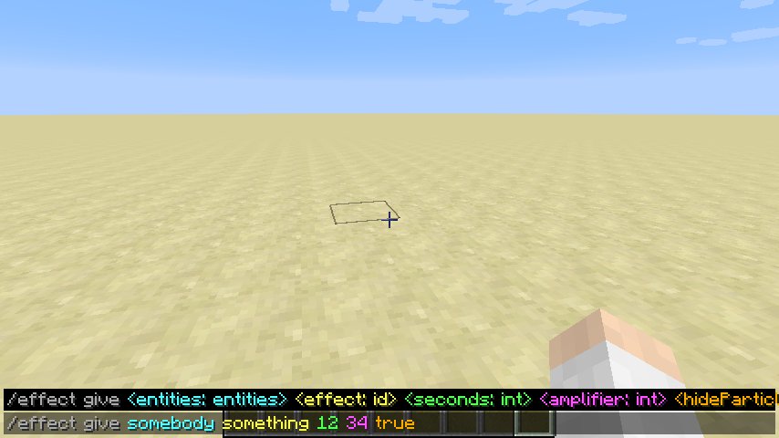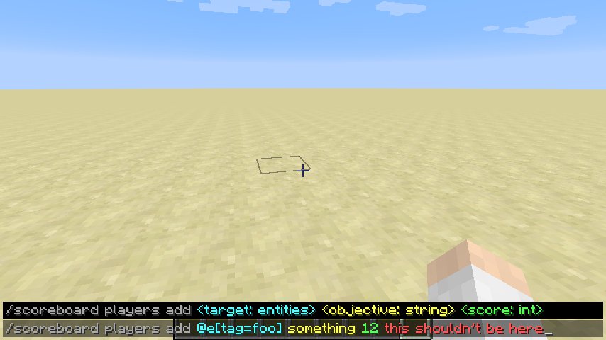 На опубликованных скриншотах видно, как в вводимых командах разные параметры окрашивают в различные цвета. Так на скриншоте, приведённом ниже, NBT-тэги подсвечены голубым цветом, текстовые параметры — жёлтым, цифровые значения — зелёным, а ошибочно введенные данные — красным.