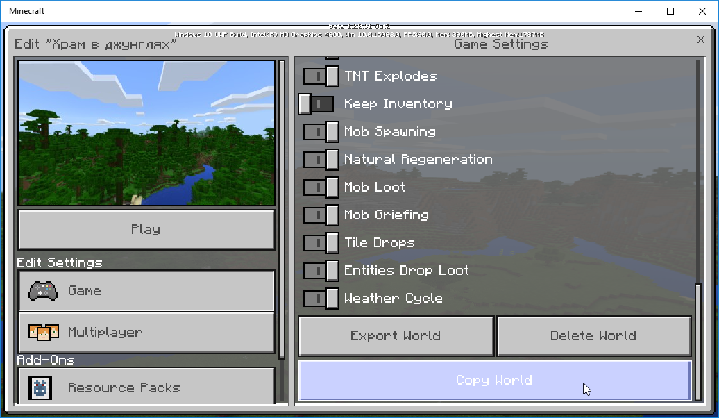 - Появилась возможность копирования мира. Для этого в режиме редактирования карты добавлена соответствующая кнопка (см. скриншот ниже).