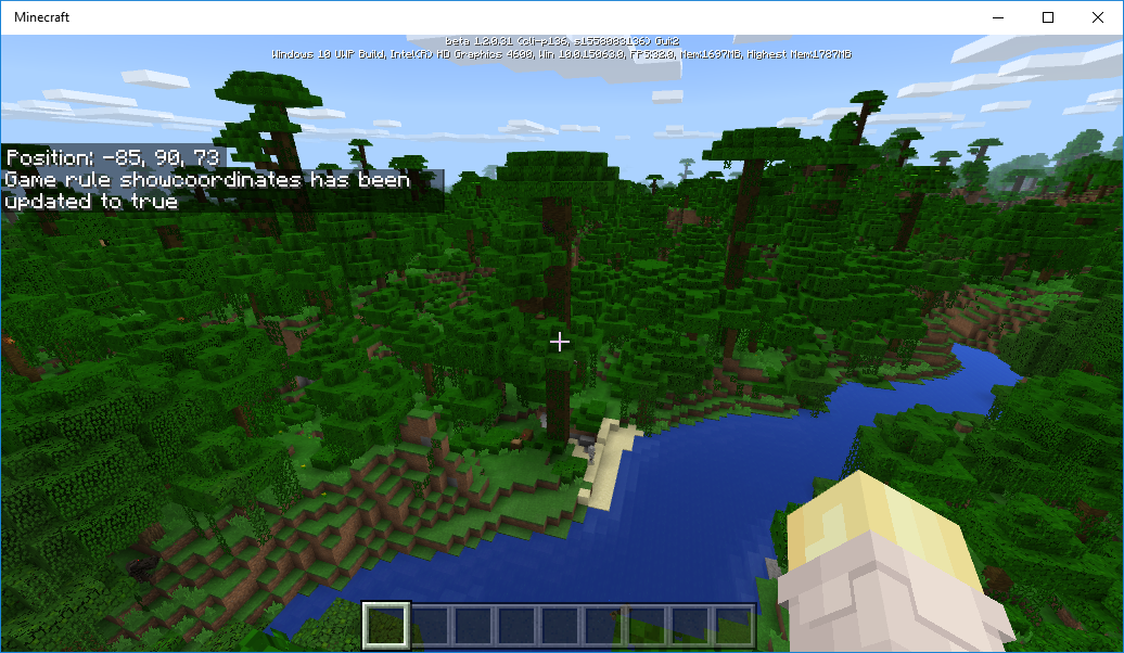 - Координаты! Включить можно в меню настроек игры или используя игровое правило showcoordinates. На мой взгляд — это не самое лучшее решение. Дело в том, что в данном случае отображение координат привязано к миру. При этом если в мире находится несколько игроков, то координаты будут видеть все. Всё-таки гораздо интереснее было отображать координаты на картах.