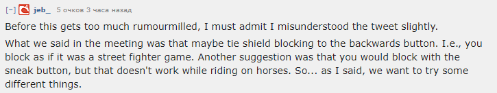 «То о чём речь шла на совещании, так это о возможной привязки блока щитом к кнопке «назад». То есть, так как это было в игре Street Fighter. Было и другое предложение — блокировать по нажатию кнопки «красться» (Sneak), но это не будет работать во время скачки на лошади. Поэтому… как я уже сказал, мы хотим попробовать что-то другое».