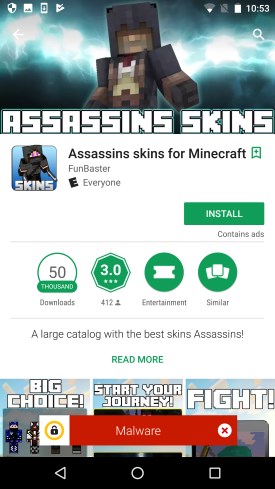 Восемь обнаруженных приложений представляли собой коллекции скинов для Minecraft. И эти приложения были довольно популярны (число установок от 600 тысяч до 2.6 миллионов). Вредоносный код в приложениях была замаскирован под функцию показа реклама, хотя сами приложения рекламу не демонстрировали.