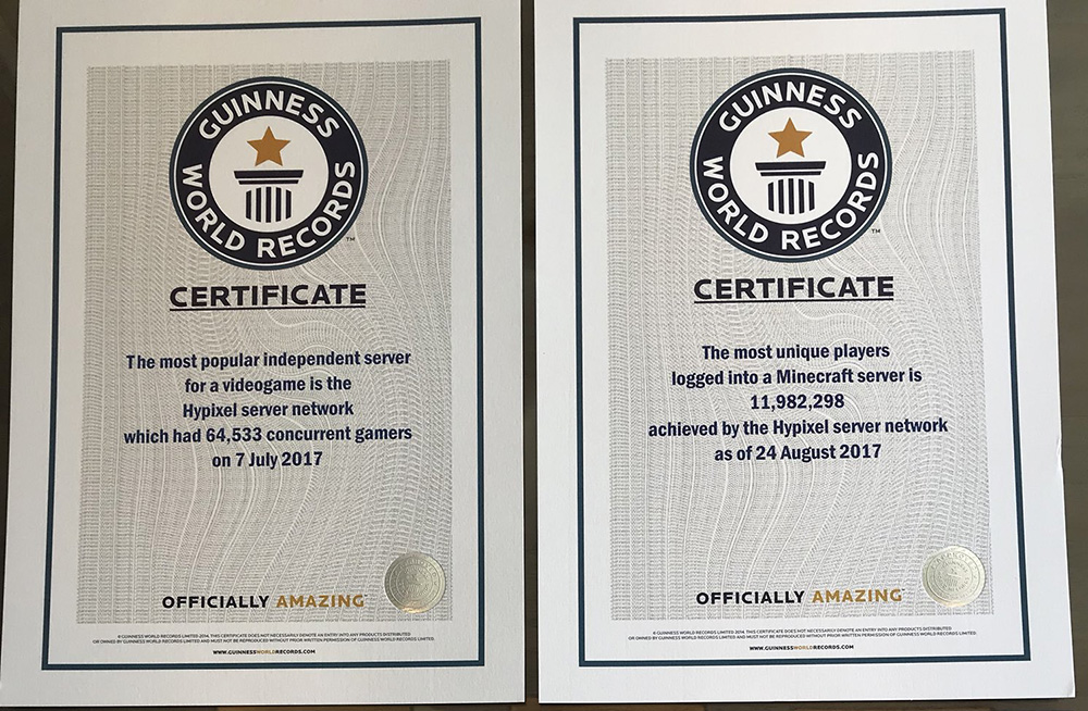 Сервера Hypixel попали в книгу рекордов Гиннеса. Об этом сообщили в официальном твитер-аккаунте игровой сети. При этом, в продемонстрированных сертификатах, отражено два рекорда: