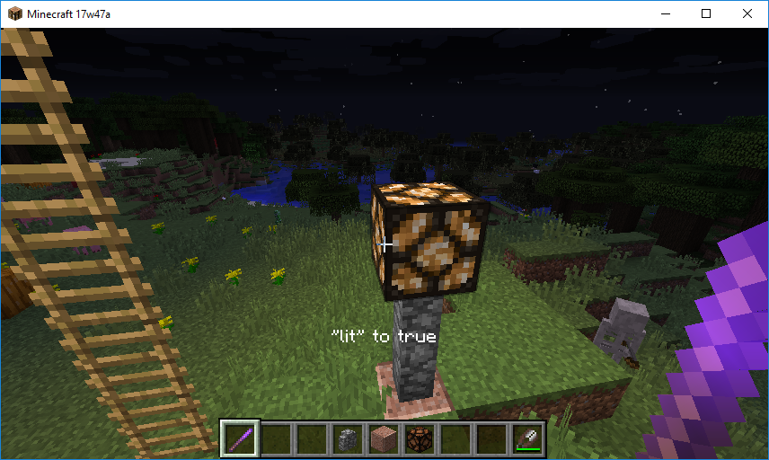 Теперь блоки которые представляли собой разные варианты одно и того же блока технически стали разными блоками и разными идентификаторами, а необходимые параметры были преобразованы в NBT-теги блоков (направление ступеней или выбор стороны блока, к которой крепится, допустим, лестница).