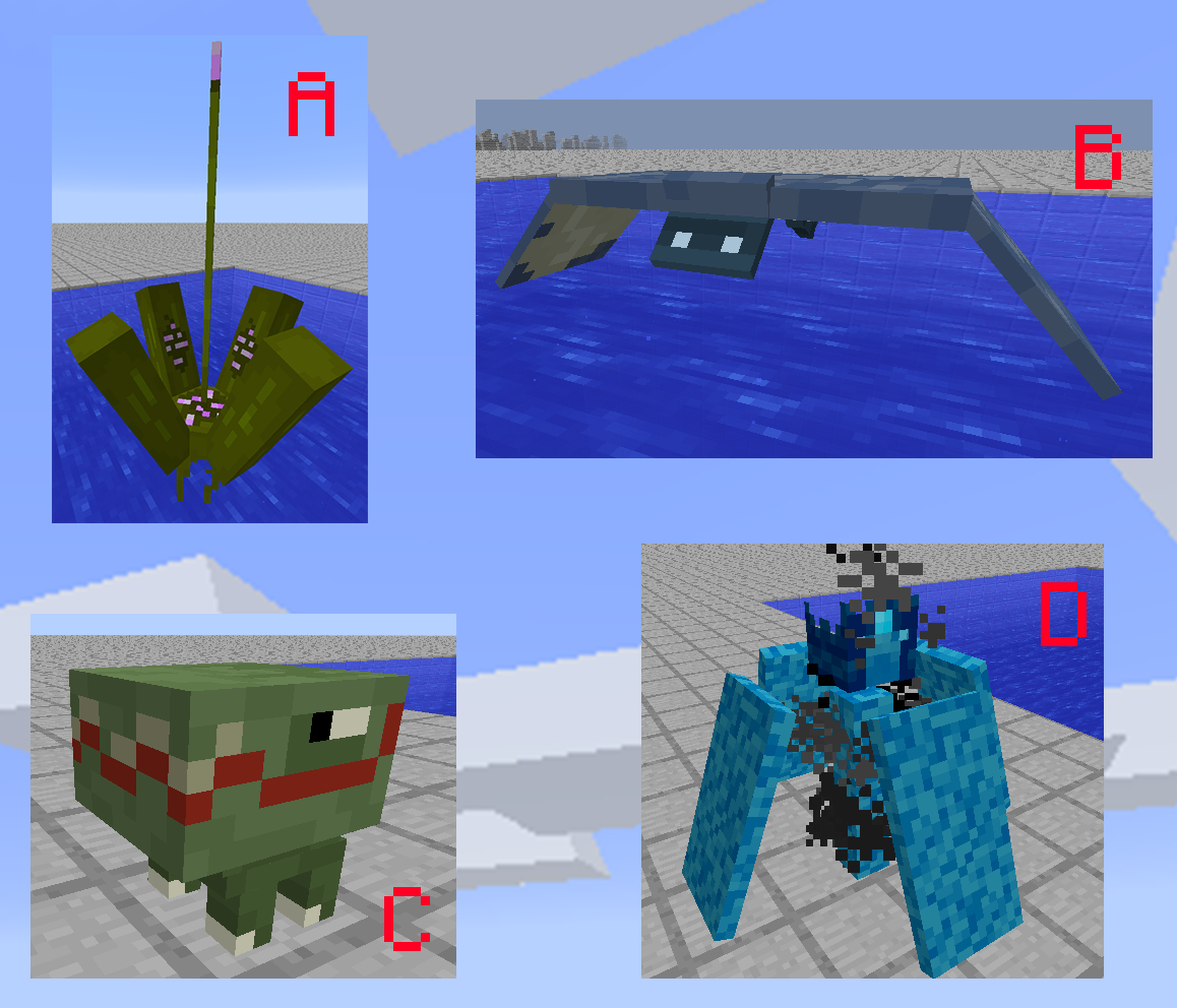 По его мнению мобы A и B — водоплавающие, моб C — это нечто зубастое (своеобразная смесь бульдога с крокодилом), а моб D — это всполох, в шлеме.