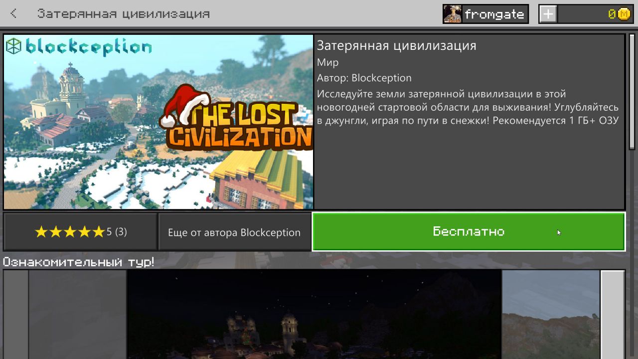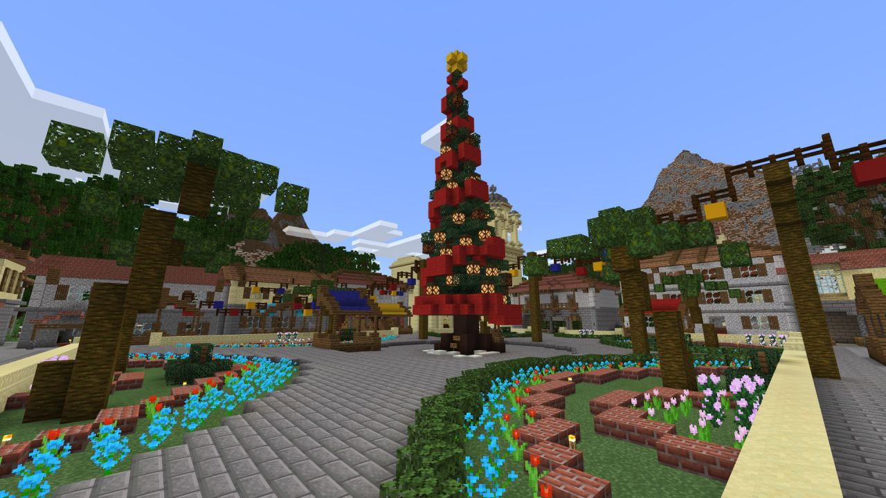 Второй день подарков от создателей Minecraft приносит карту «Затерянная цивилизация». Это пустынный мир, на спавне которого растут пальмы и установлена новогодняя ёлка.