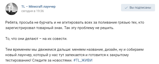 Вчера в сообществе TLauncher Legacy появилась вот такая мрачная картинка. Это было связано с тем, что на сообщество была подана жалоба. Жалоба была подана владельцем прав на название TLaunсher — проектом TLauncher.org, который занимается распространением одноименного пиратского лаунчера Minecraft.
