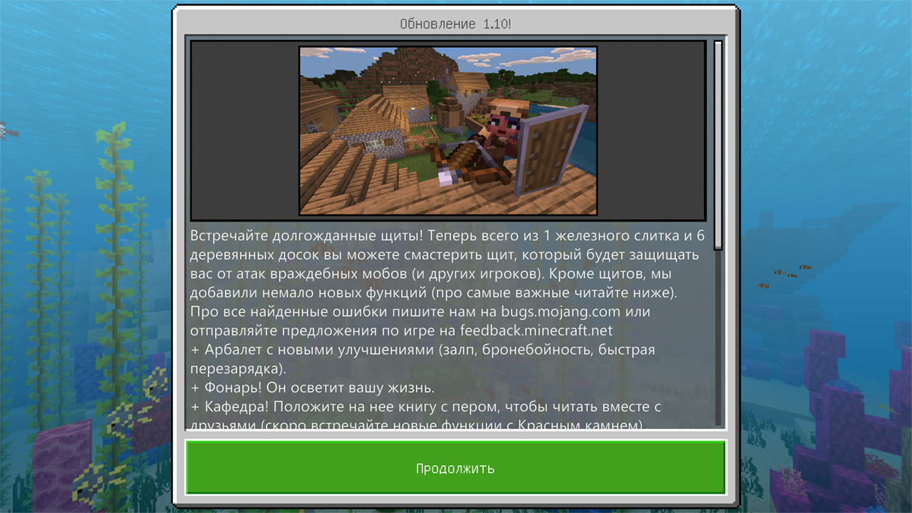 Вышла новая версия Minecraft для мобильных устройств, Windows 10, Xbox One и Nintendo Switch. В этой версии наконец-то добавлены щиты, кроме того, в ней появилась функциональность, относящаяся к следующему большому обновлению игры «Деревни и Разбойники».