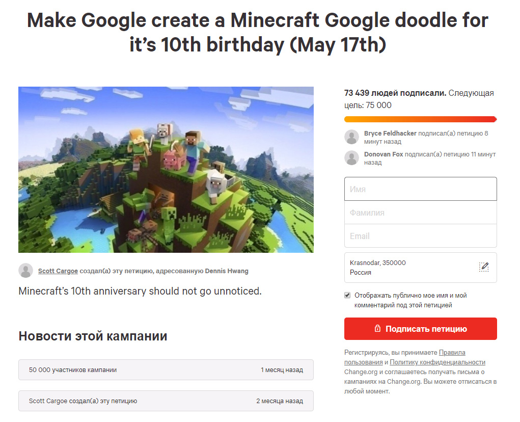 На сайте Change.org опубликована петиция, в которой поклонники игры просят компанию Google отобразить 17 мая в поисковике дудл (doodle), посвященный игре Minecraft.