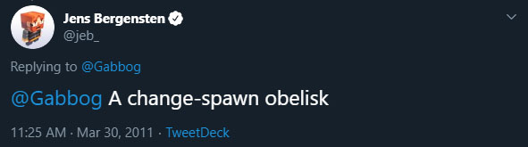 Тогда разработчики обдумывали механику создания точки возрождения игрока, и плачущий обсидиан вводился в игру именно для этого. В твиттере осталось сообщение Йенса Бергенстена (Джеба) о спавн-обелиске.