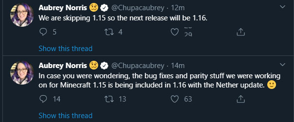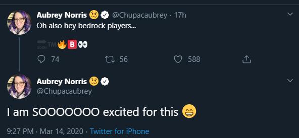 Судя по всему, твит Обри говорит о том, что скоро выйдет первая бета-версия Minecraft Bedrock с элементами «Обновления Незера» — т.е. бета-версия Minecraft 1.16. В этом случае можно ждать скорого релиза версии Minecraft 1.15, т.е. о каких-то других изменениях говорить не приходится.