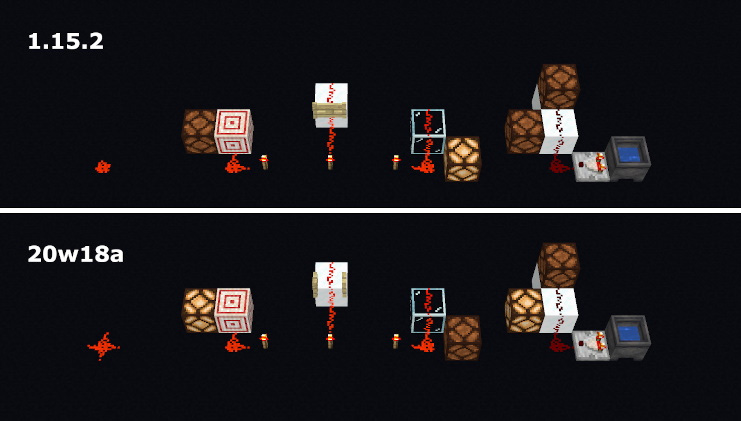Состояния блока, отображение и поведение редстоуна теперь больше соответствует друг другу. Редстоун будет передавать энергию тем блокам, с которыми визуально отображена связь, и не будет это делать в тех направлениях, где визуальной связи нет.