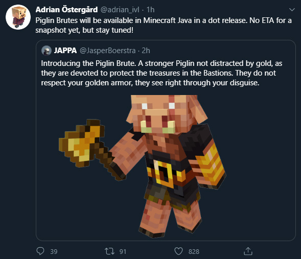 Разработчики Minecraft Java Edition сразу подтвердили, что брутальный пиглин появится в Minecraft Java Edition в одной из версий 1.16.x.