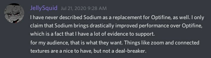 Я никогда не определяла Sodium в качестве замены Optifine. Я только подчёркивала, что Sodium гораздо лучше, чем Optifine, увеличивает производительность — этот факт я могу подтвердить множеством доказательств. Такие вещи как зум, соединение текстур — это круто, но это не главное.