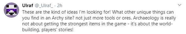 «Именно такие идеи я ищу! Какие другие уникальные вещи можно найти на археологических раскопках? Не просто какие-то инструменты или руду. Археология — это не о получении сильнейших предметов в игре, это об изучении мироустройства, историй игрока!».