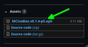 ЗагрузитьMCinaBox можно с GitHub разработчика. На этой странице нужно скачать последний APK, в моём случае это v0.1.4-p5.
