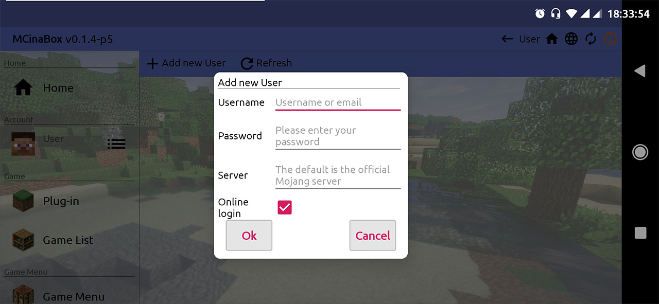 Отлично, теперь устанавливаем и запускаем наш APK. В нём первым делом нужно задать пользователя, войдя в аккаунт Mojang (можно просто указать ник игры оффлайн).