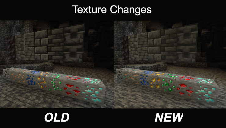 - Добавлены глубинно-сланцевые версии руд железа, золота, лазурита, редстоуна и алмаза, которые появляются там, где при генерации эти руды замещают глубинный сланец.
