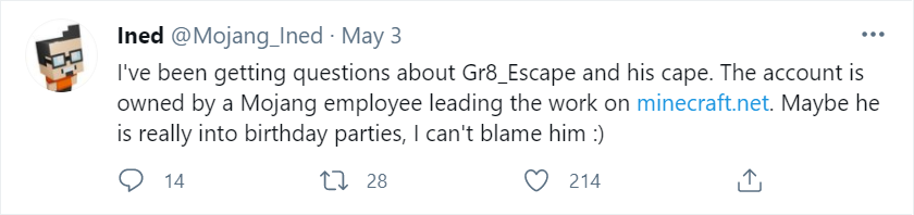 «Я получаю вопросы о Gr8_Escape и его плаще. Этот аккаунт принадлежит сотруднику Mojang, ведущему разработчику minecraft.net. Возможно, он действительно любит вечеринки по случаю дня рождения, я не могу его винить :)».