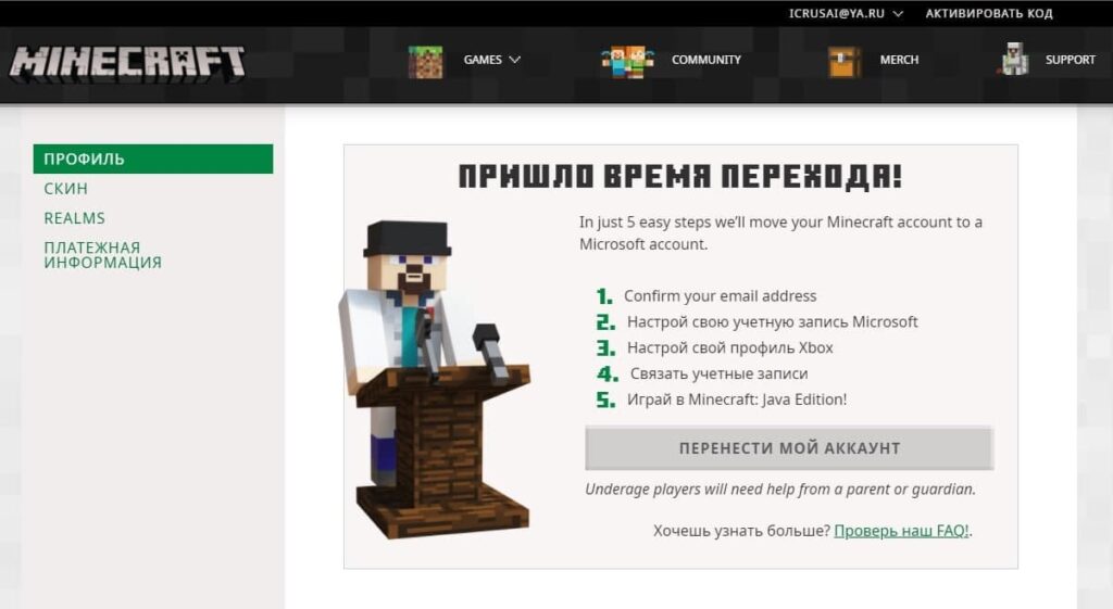 На сайте Minecraft уже некоторое время разрабатывается раздел, посвящённый миграции аккаунтов. В нашем телеграм-канале уже публиковались изображения, который смог получить Артём Баженов.