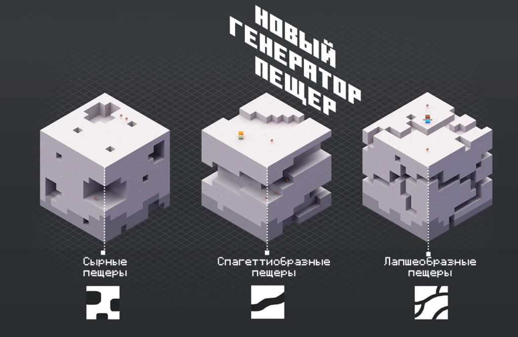 Ну какое может быть обновление «Пещеры и скалы» без больших изменений в генерации пещер! В новой версии будут встречаться не только пещеры и овраги из предыдущих версий, но и множество пещер новых видов — огромные «сырные пещеры», длинные протяжённые «спагеттиобразные пещеры» и запутанные сети «лапшеобразных пещер».