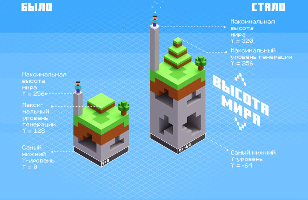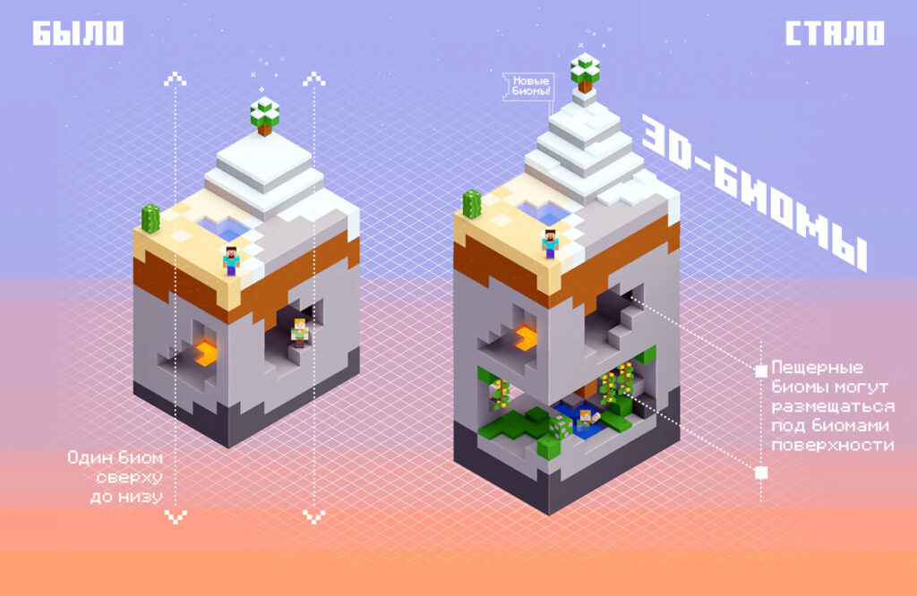 В этой версии были расширены вертикальные пределы обычного мира, благодаря чему у вас появилось больше пространства для строительства и исследования. Можно строить вплоть до высоты y=320 или, если вы достаточно храбры, отправиться вглубь вплоть до глубины y=-64, открывая огромные пещеры и восхитительные подземные биомы.