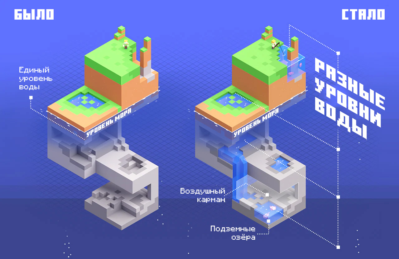 Игроки, которые обновят свои миры, также обнаружат, что бедрок на уровне y=0 заменён глубинным сланцем, под которым сгенерируются новые пещеры и биомы.