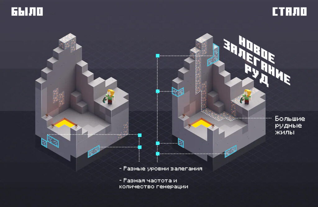 Кроме привычных форм залегания, была добавлена новая — это большие рудные жилы, которые тянутся вдоль новых пещерных систем. Это большие скопления руд, гораздо больше, чем обычные кластеры руды, которые можно найти под землей.