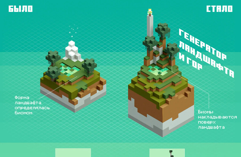 В Minecraft 1.18 форма ландшафта теперь не всегда определяется биомом. Вместо этого биомы простилаются по заданному ландшафту. Это значит, что игроки, исследуя обычный мир, могут встречать самые странные и неожиданные биомы.