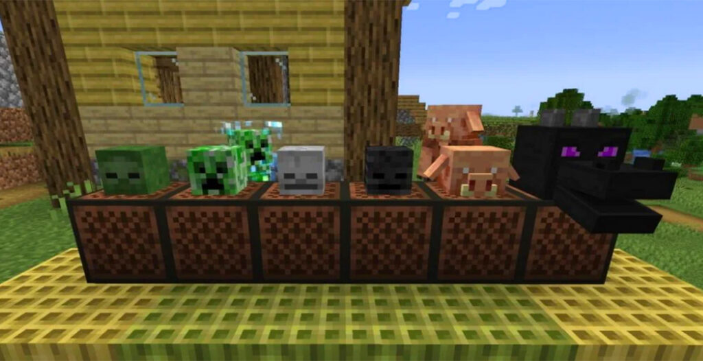 - Если установить голову моба на нотный блок, то блок будет воспроизводить звуки, соответствующие этому мобу.