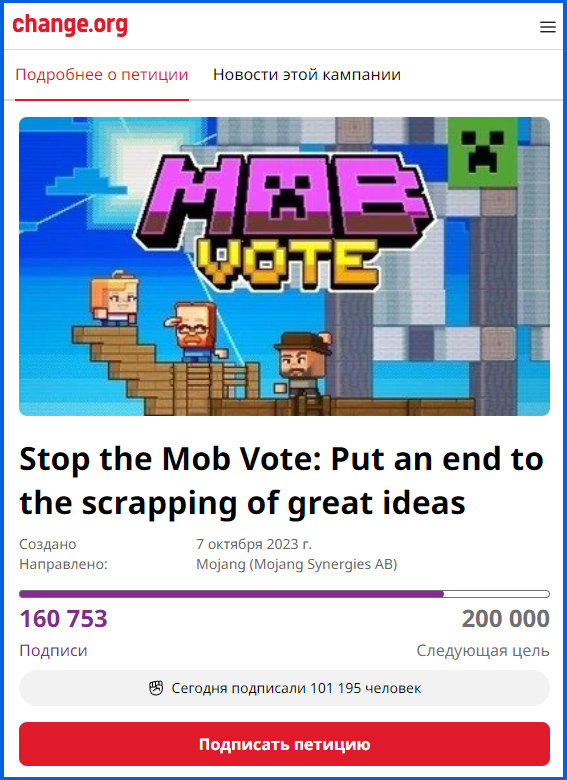 В этом году появилось что-то новое — на сайте change.org опубликована петиция с требованием отменить голосование и добавить в игру сразу всех мобов.